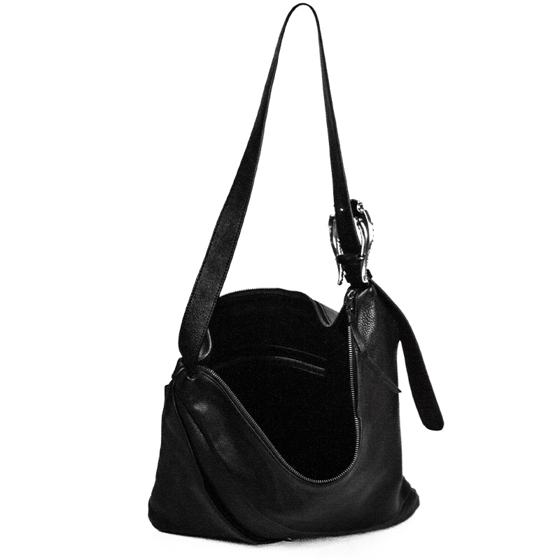 Borsa a spalla in pelle nera dal design moderno e sofisticato. Caratterizzata da una forma asimmetrica, dettagli minimal e una tracolla con inserto decorativo in metallo. Spaziosa e versatile.