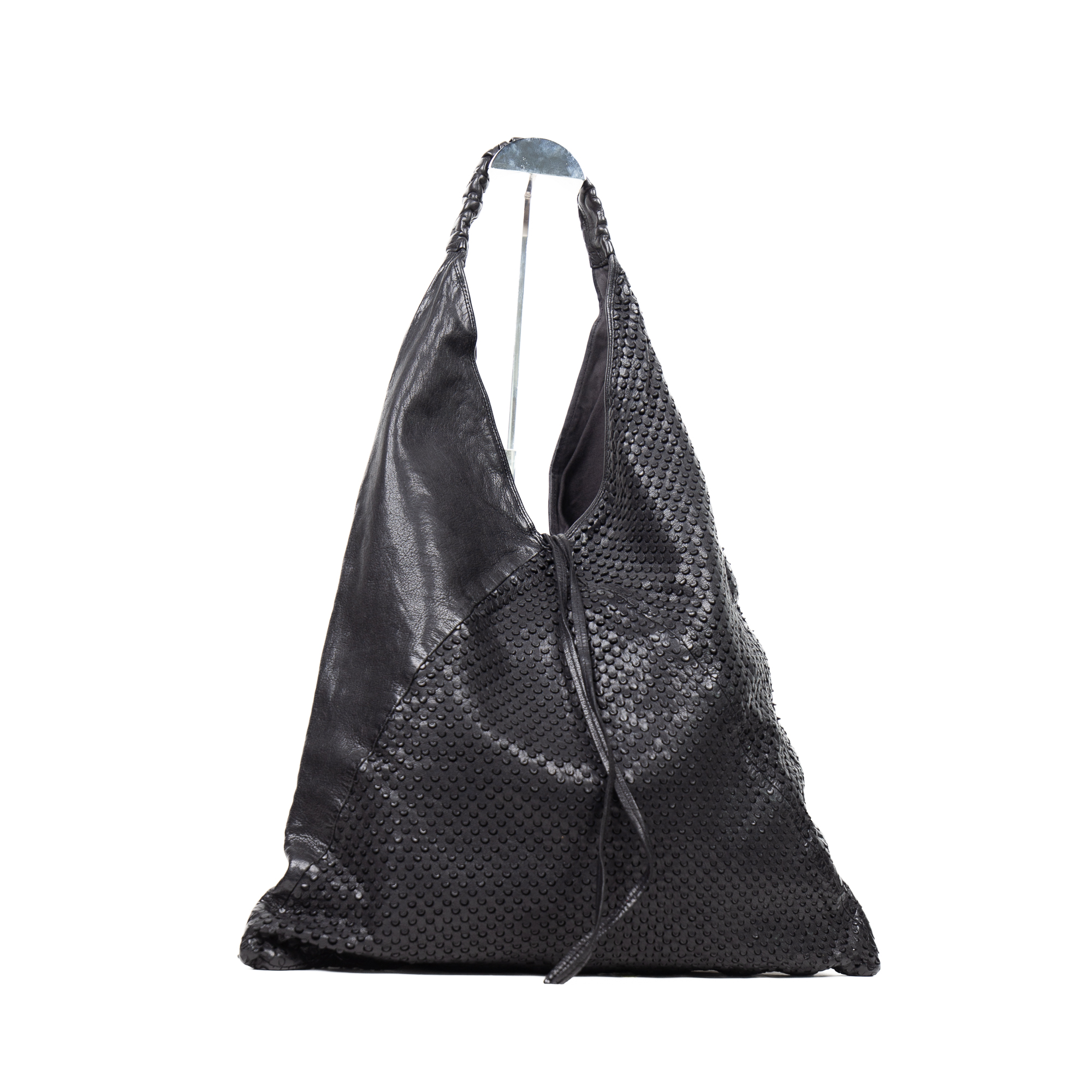 Borsa a spalla in vera pelle di vacchetta (cowhide), con pannelli in lavorazione laserata effetto 3D. Il design destrutturato e capiente la rende ideale per l’uso quotidiano, combinando eleganza artigianale e funzionalità.