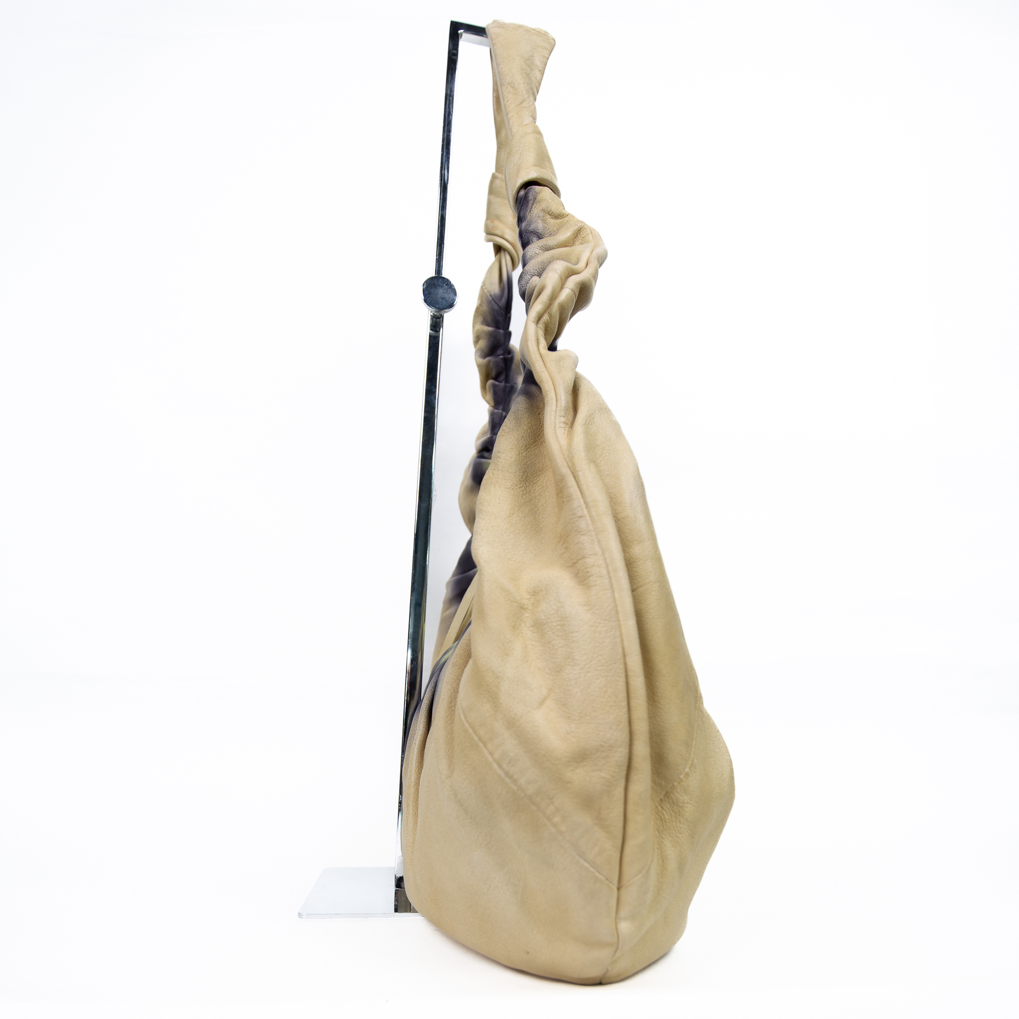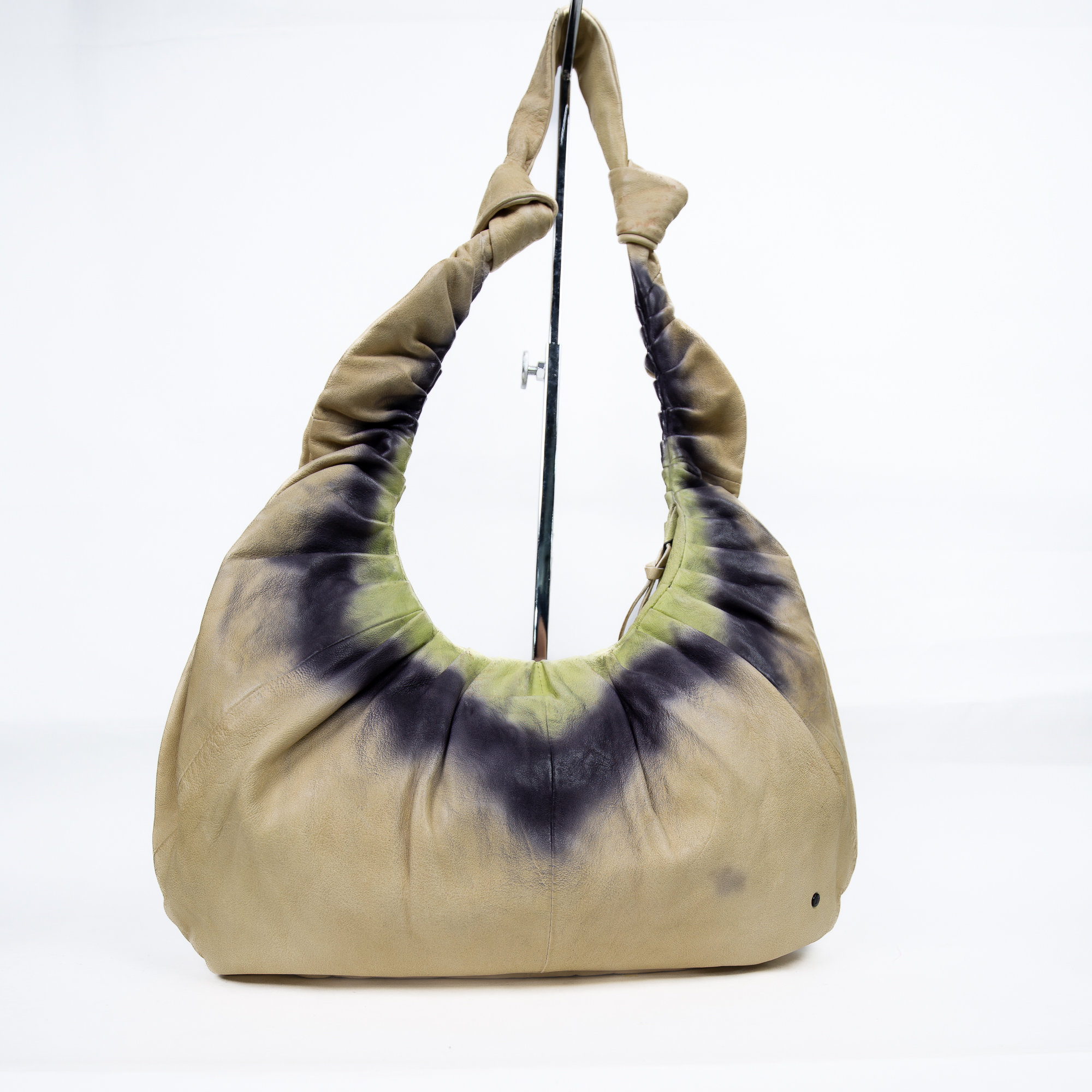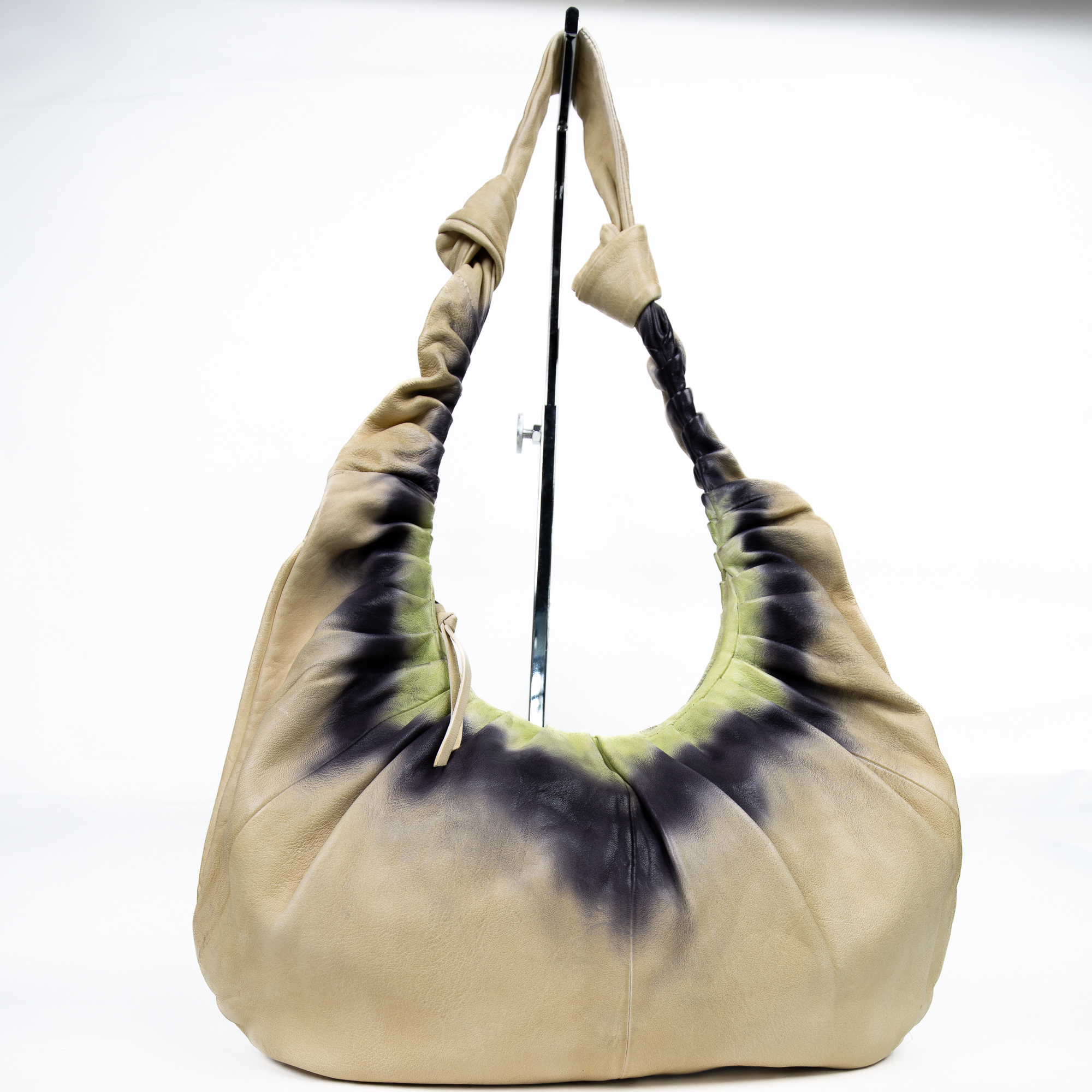 Borsa hobo in vera pelle , lavorata a mano con uno straordinario effetto tie & dye sfumato nei toni sabbia, verde lime e nero. Il corpo morbido e l’impugnatura ampia e flessibile la rendono perfetta da indossare a spalla, per uno stile rilassato ma distintivo.