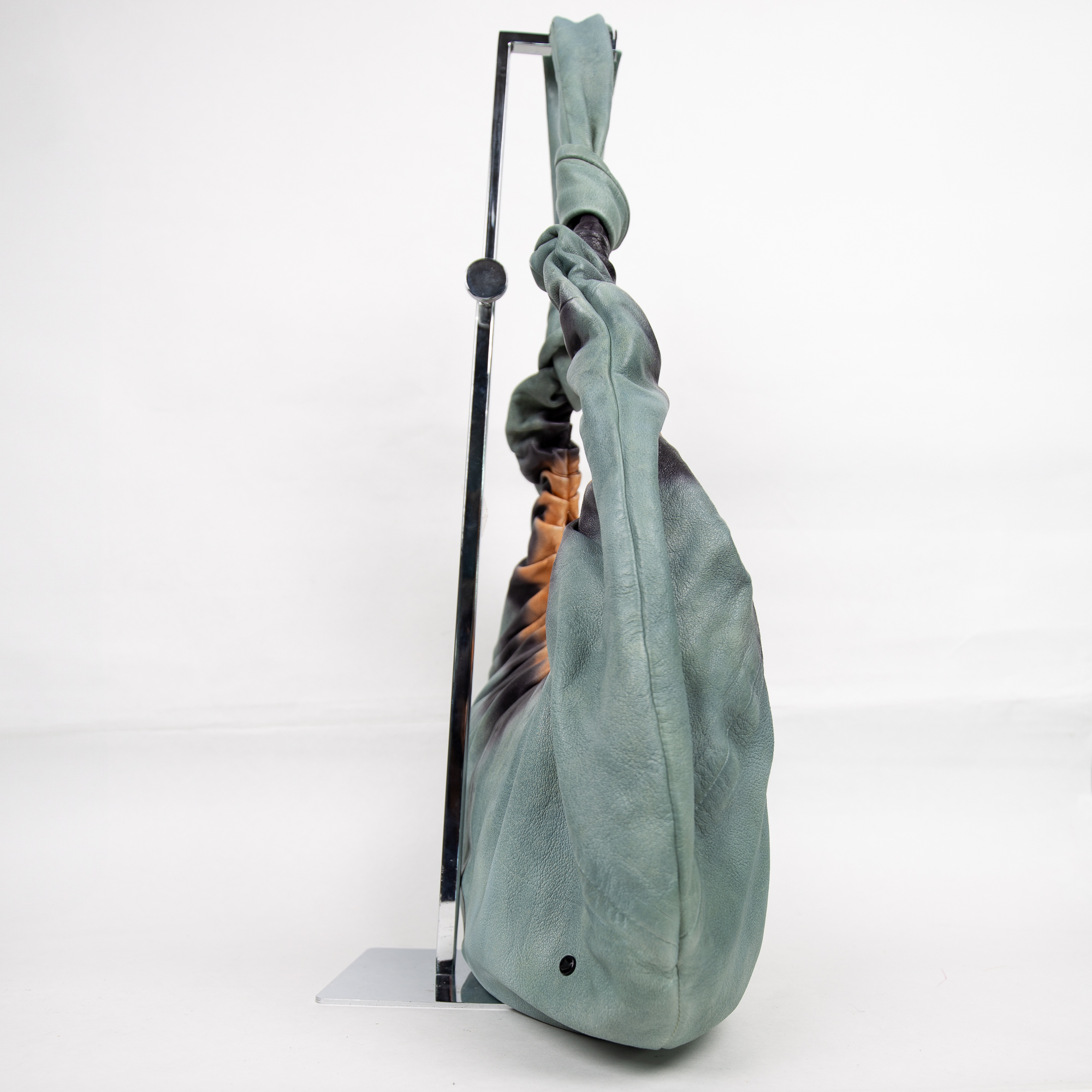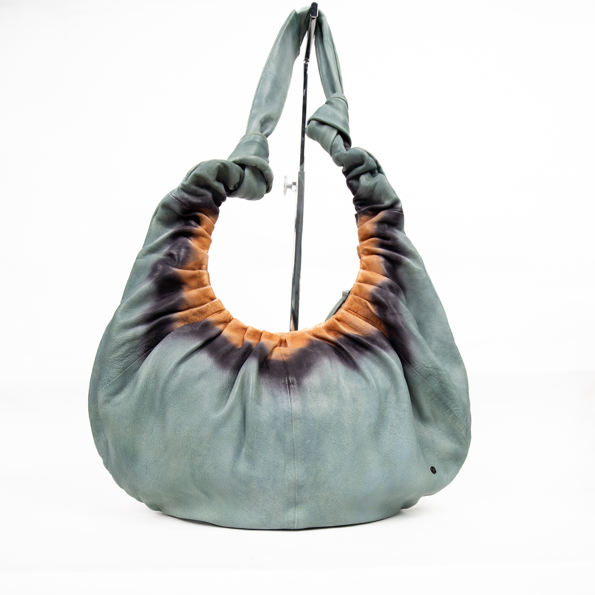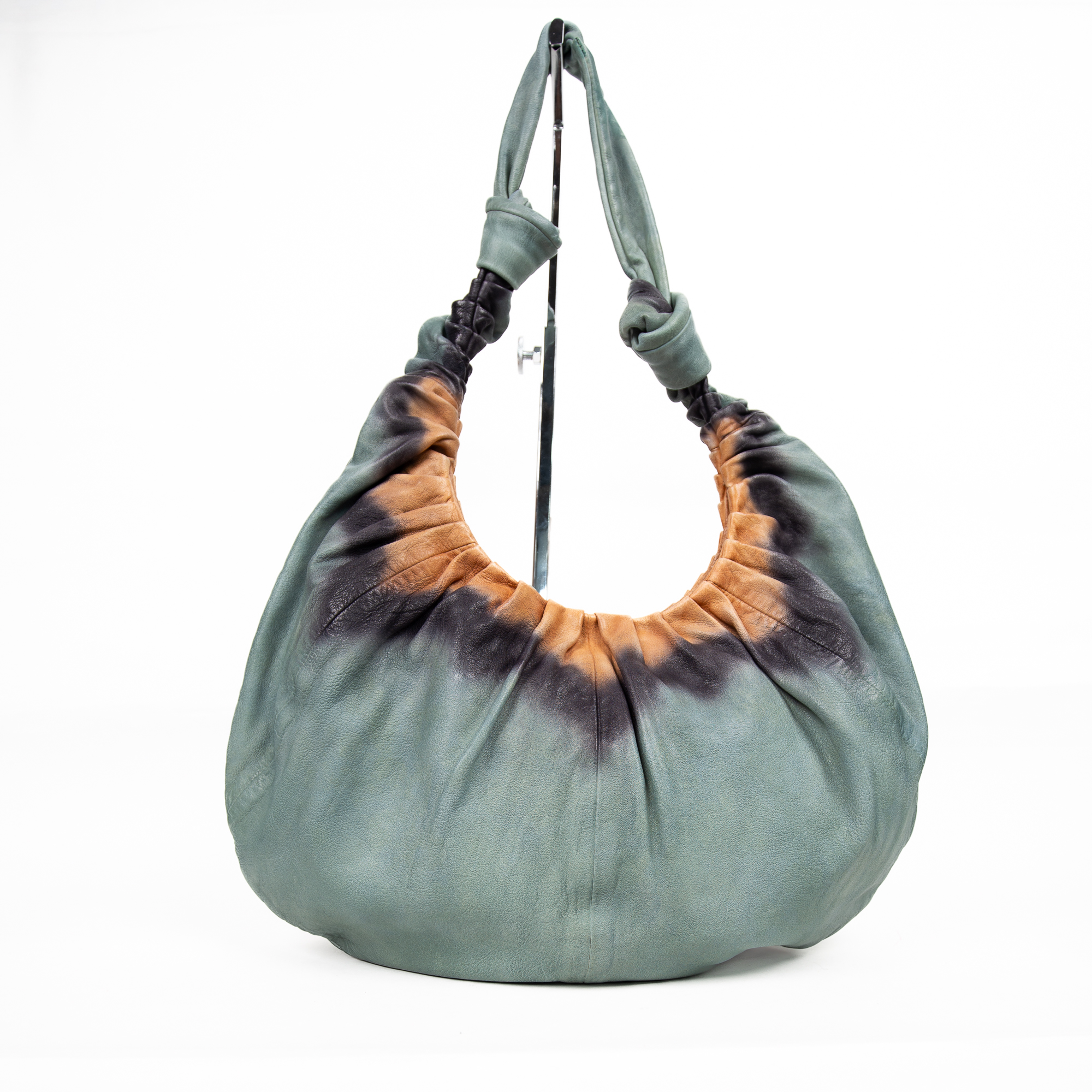 Borsa hobo in vera pelle , lavorata a mano con uno straordinario effetto tie & dye sfumato nei toni sabbia, verde lime e nero. Il corpo morbido e l’impugnatura ampia e flessibile la rendono perfetta da indossare a spalla, per uno stile rilassato ma distintivo.