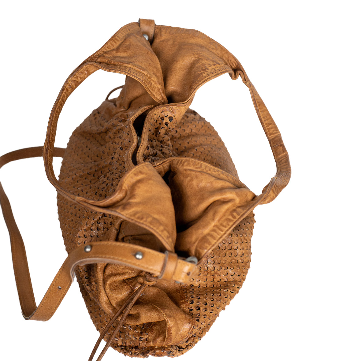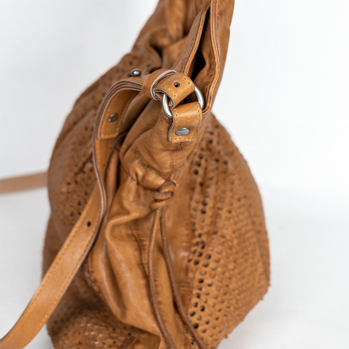 Borsa a spalla da donna del brand REHARD, realizzata in vera pelle cuir (marrone cuoio). Il modello presenta un pannello frontale con lavorazione effetto intrecciato, una struttura morbida e dettagli arricciati sui lati.Dotata di manico corto per portabilità a mano e tracolla lunga regolabile e removibile per utilizzo a spalla o a tracolla.