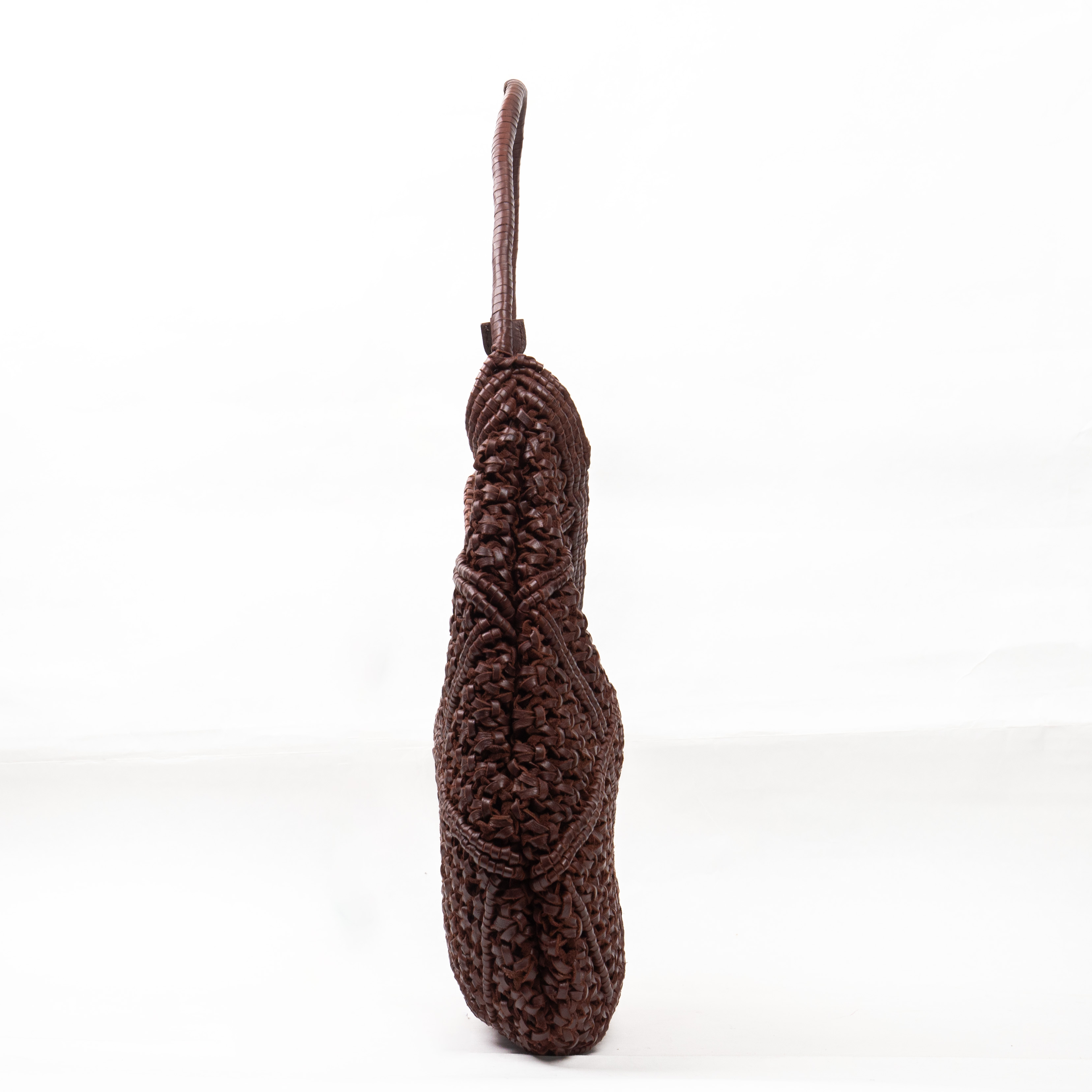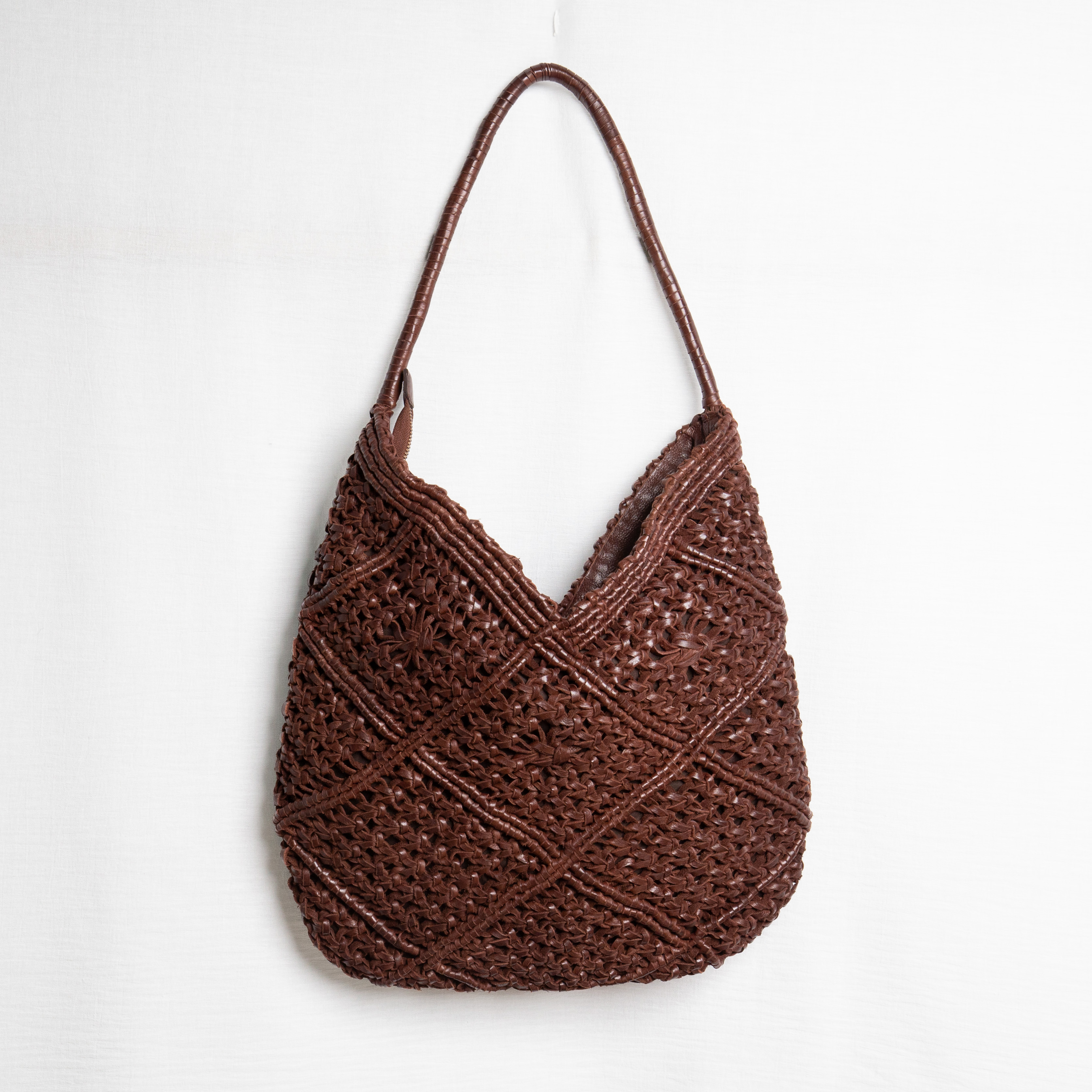 Borsa a spalla da donna realizzata artigianalmente in materiale intrecciato. Colore CHEST NUT Struttura semi-morbida con design geometrico a rombi. Manico singolo rigido rivestito nello stesso materiale intrecciato. Interno foderato con chiusura superiore tramite zip. Dimensioni medie, ideale per uso quotidiano. Prodotto leggero e resistente.