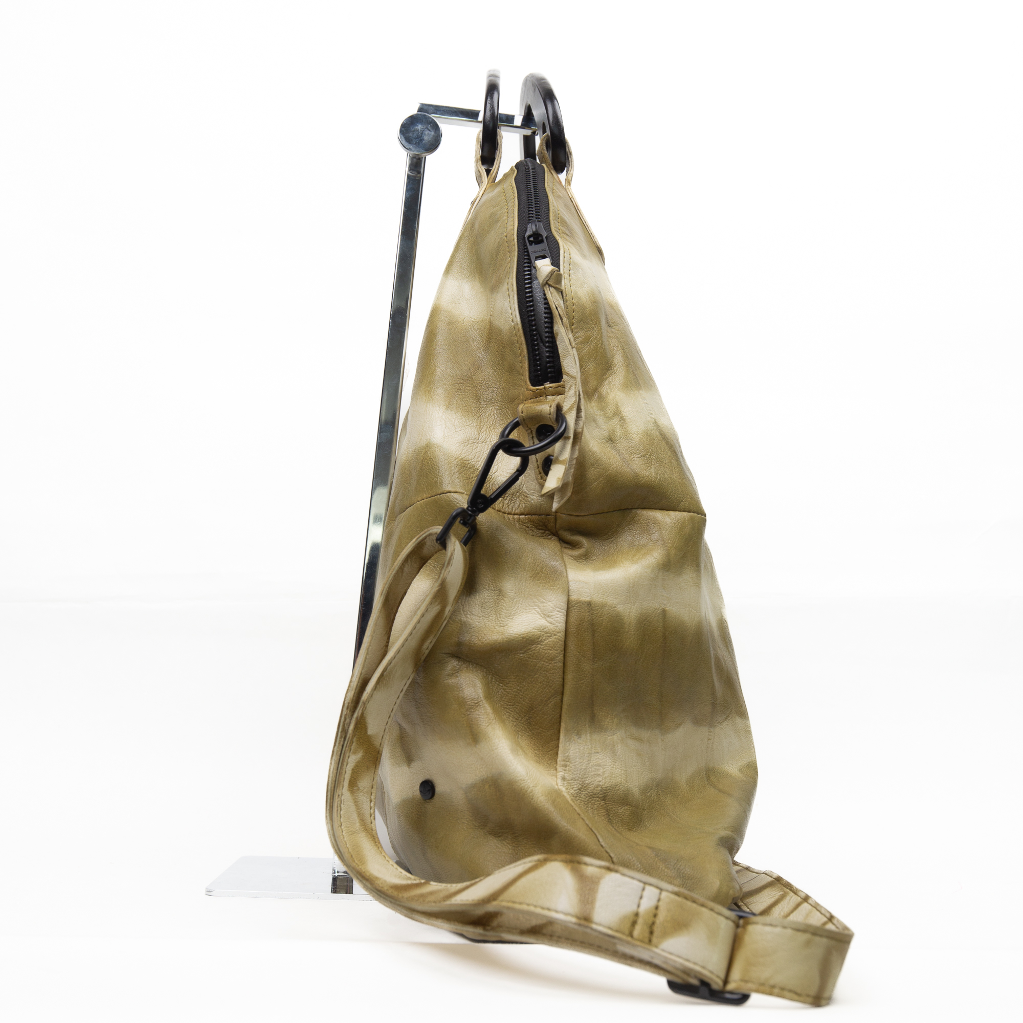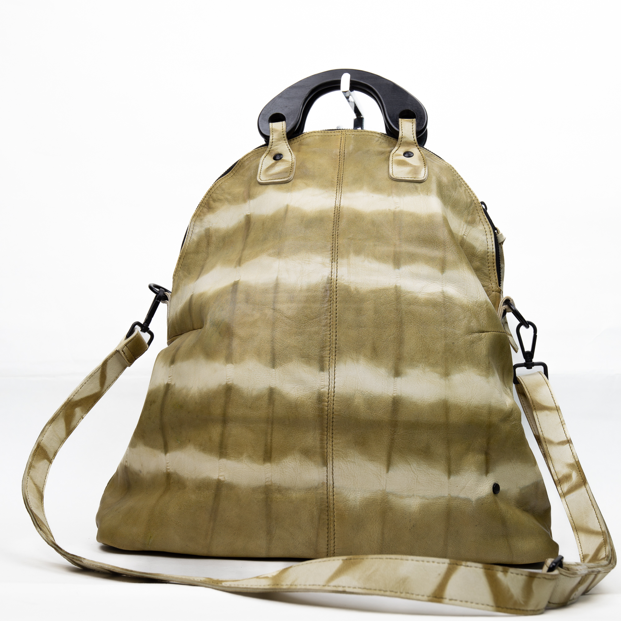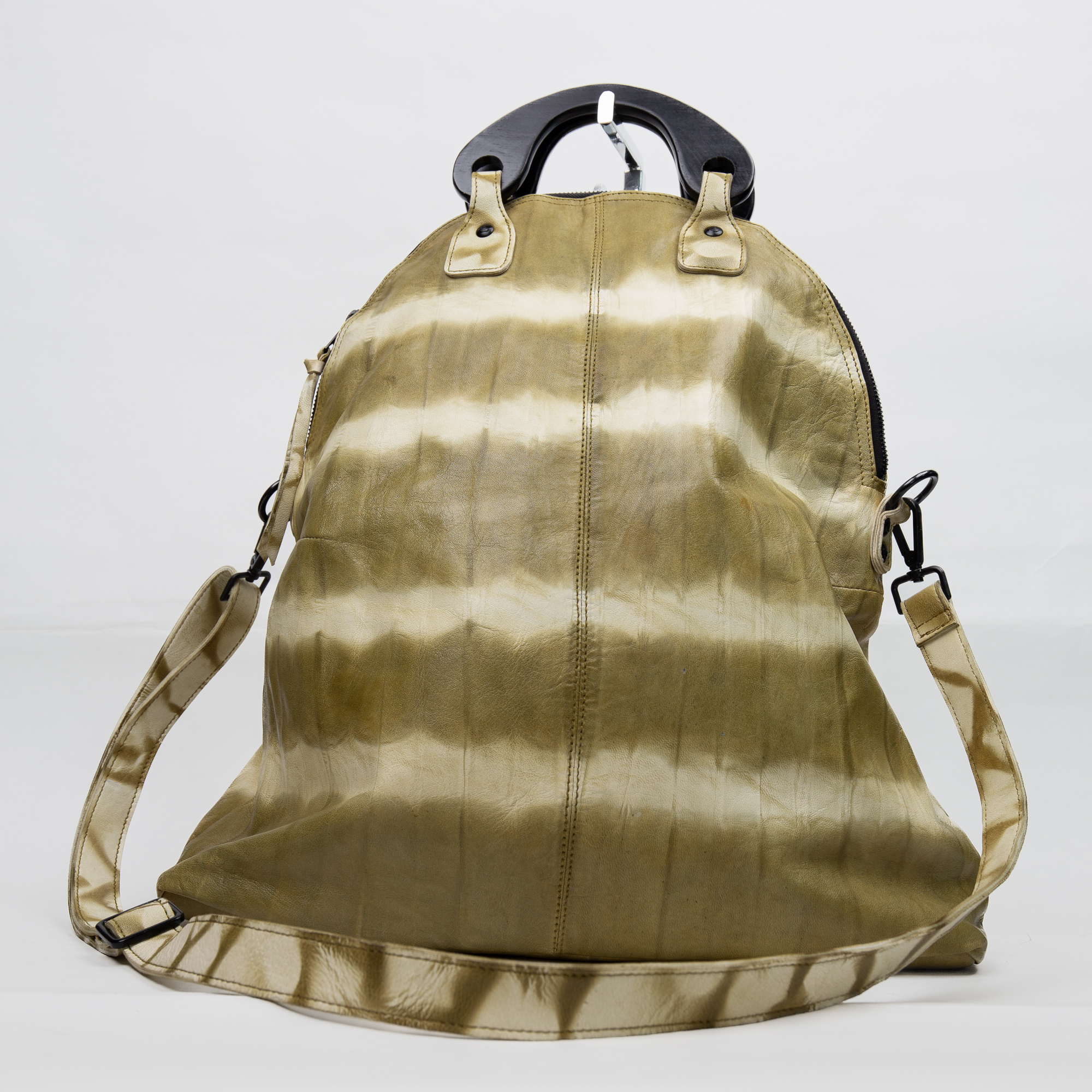 Zaino/borsa da donna in pelle naturale con effetto tie-dye nei toni beige/verde oliva. Collezione REHARD SS25. Struttura semi-morbida, manici rigidi curvi in legno nero lucido e tracolla regolabile e rimovibile per doppio utilizzo (zaino o borsa a spalla). Interno foderato, dotato di tasche multifunzione. Chiusura superiore con zip. Design moderno e funzionale, ideale per l’estate in città o in viaggio.