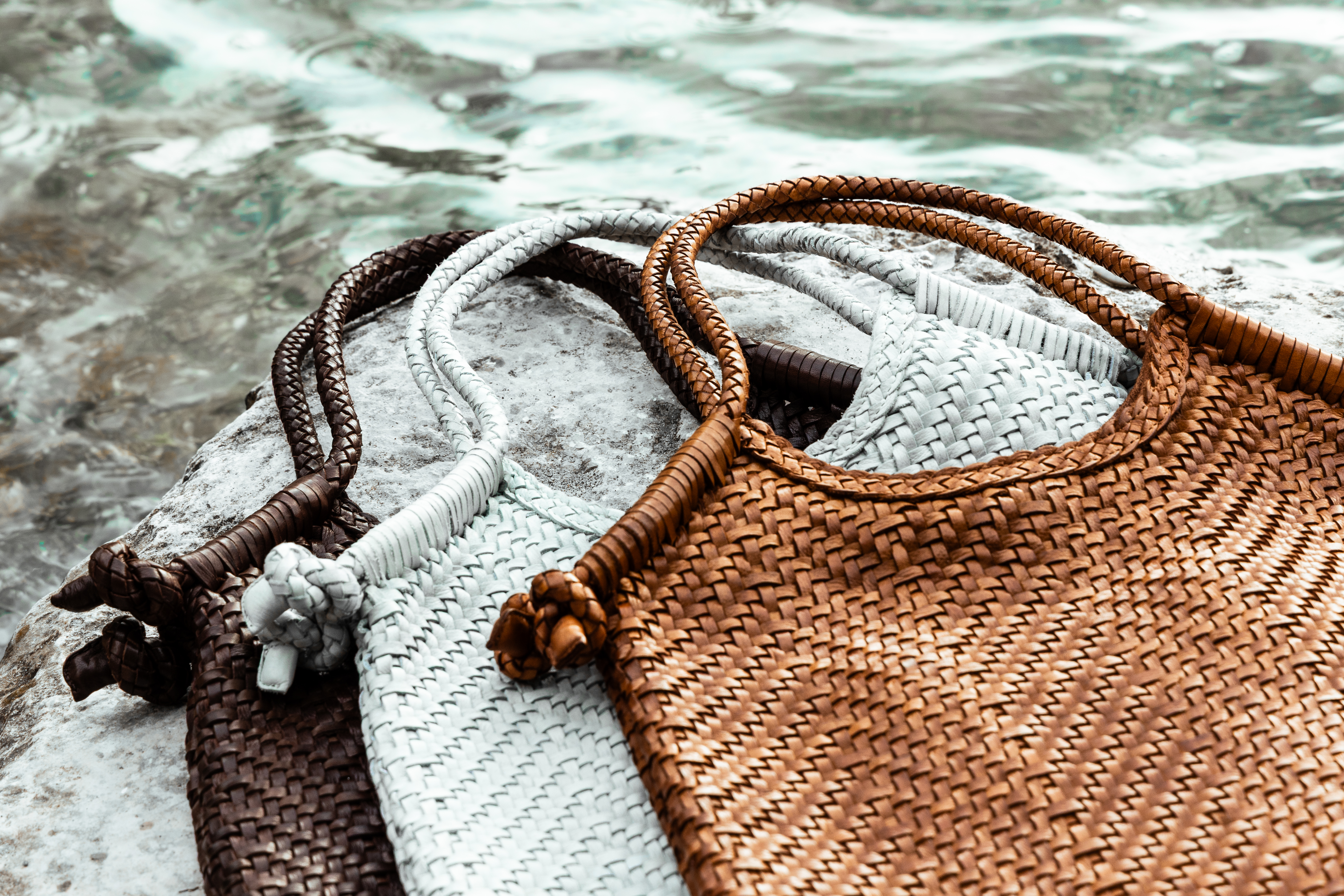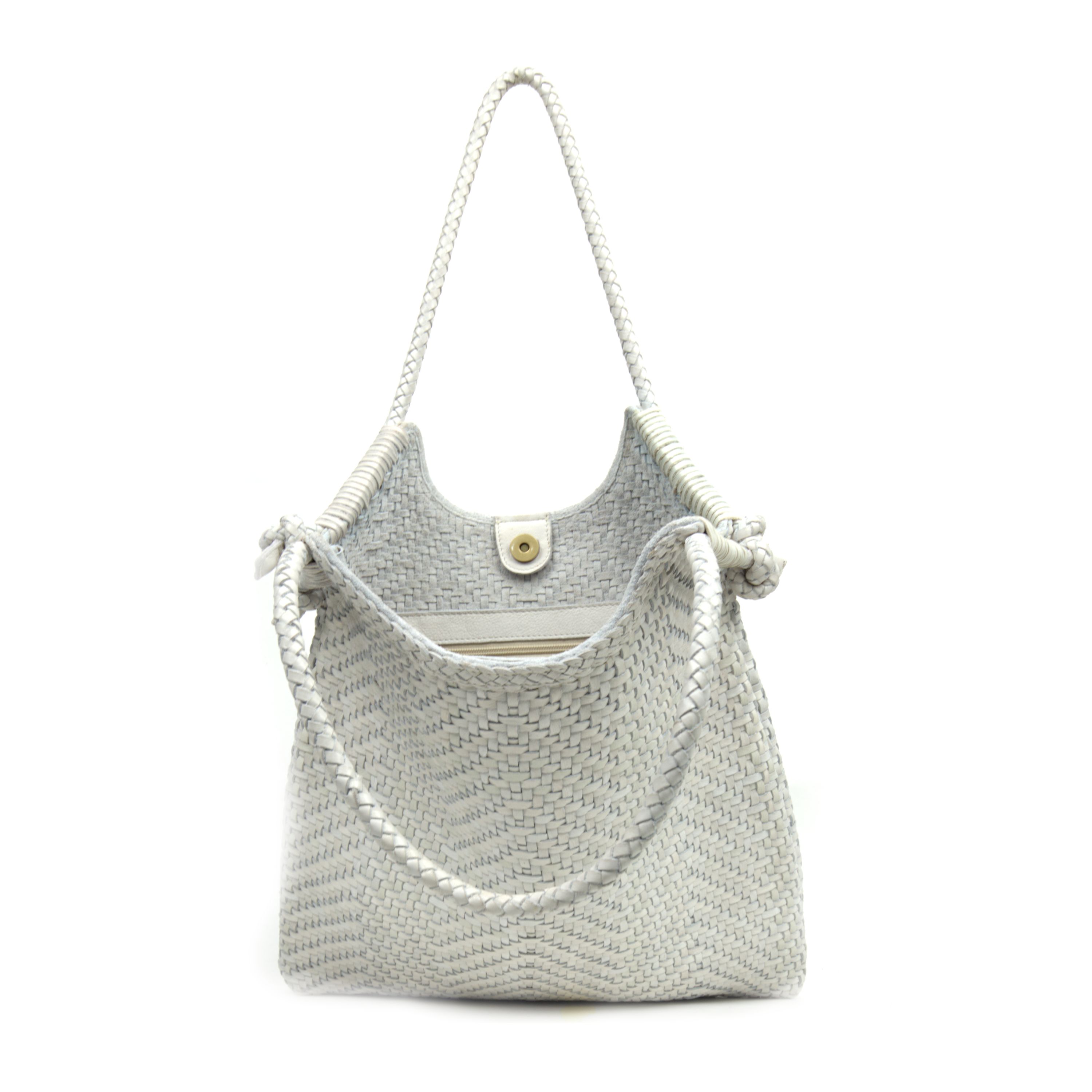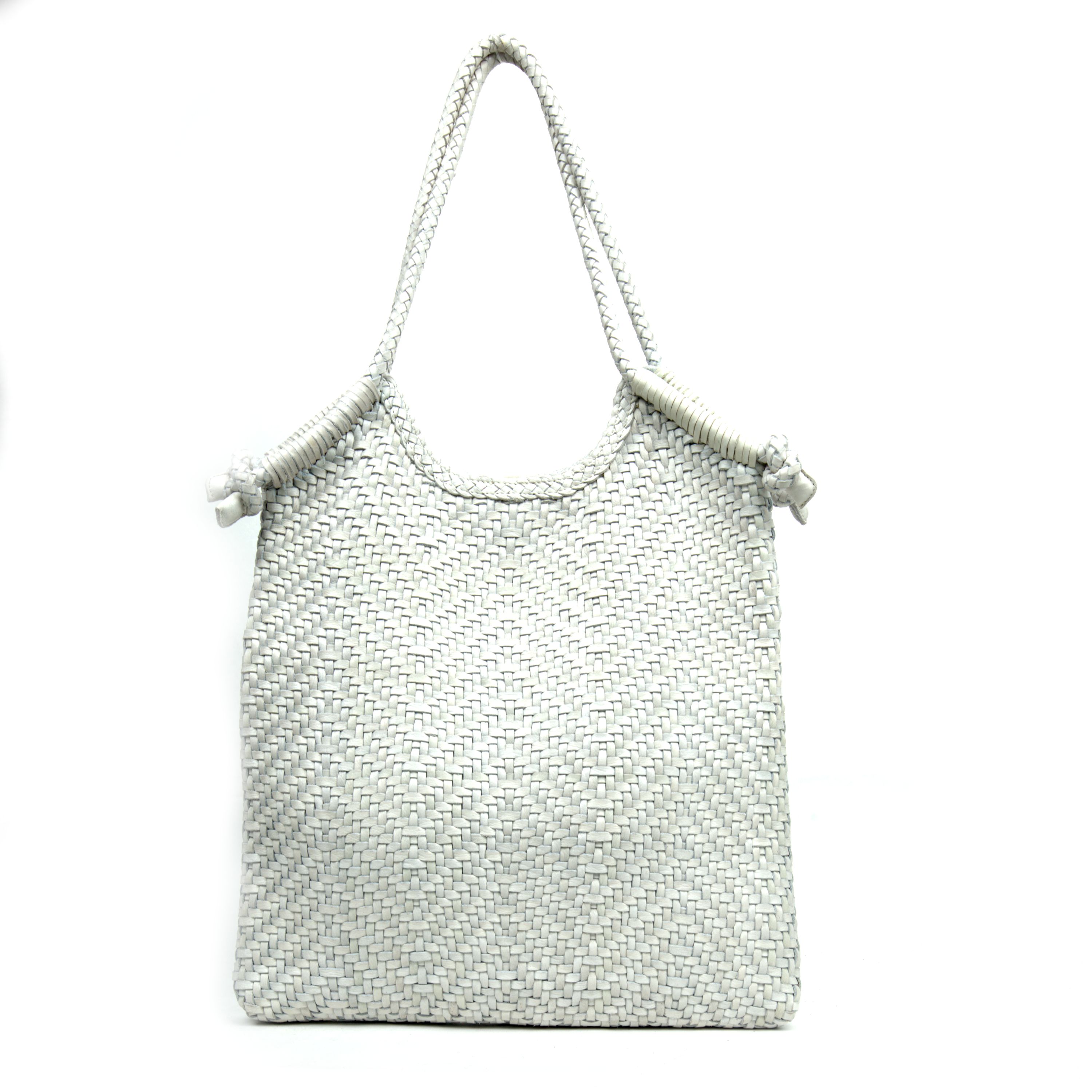 Borsa a spalla da donna realizzata artigianalmente in materiale intrecciato. Colore SAND . Struttura semi-morbida con design geometrico a rombi. Manico singolo rigido rivestito nello stesso materiale intrecciato. Interno foderato con chiusura clip. Dimensioni medie, ideale per uso quotidiano. Prodotto leggero e resistente.