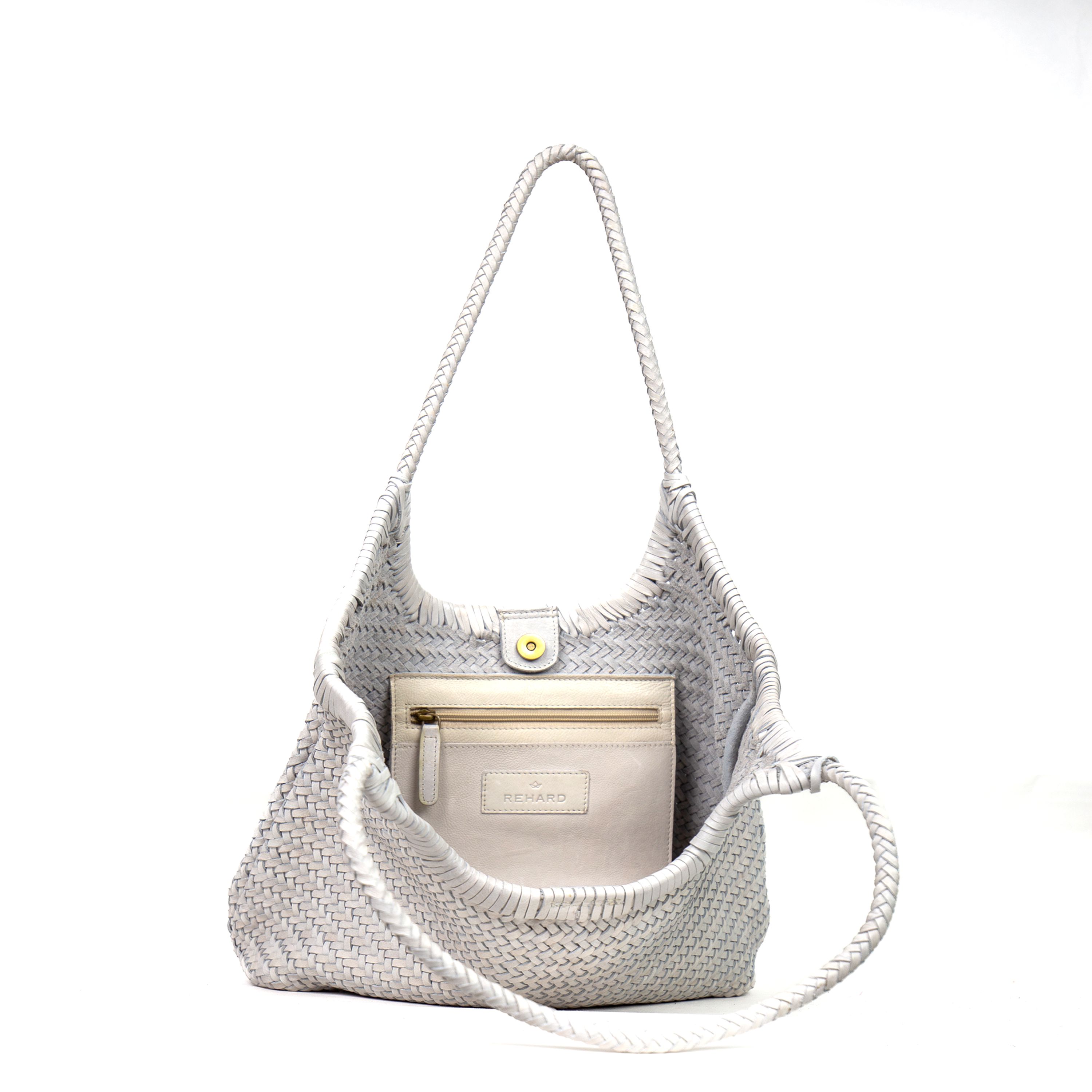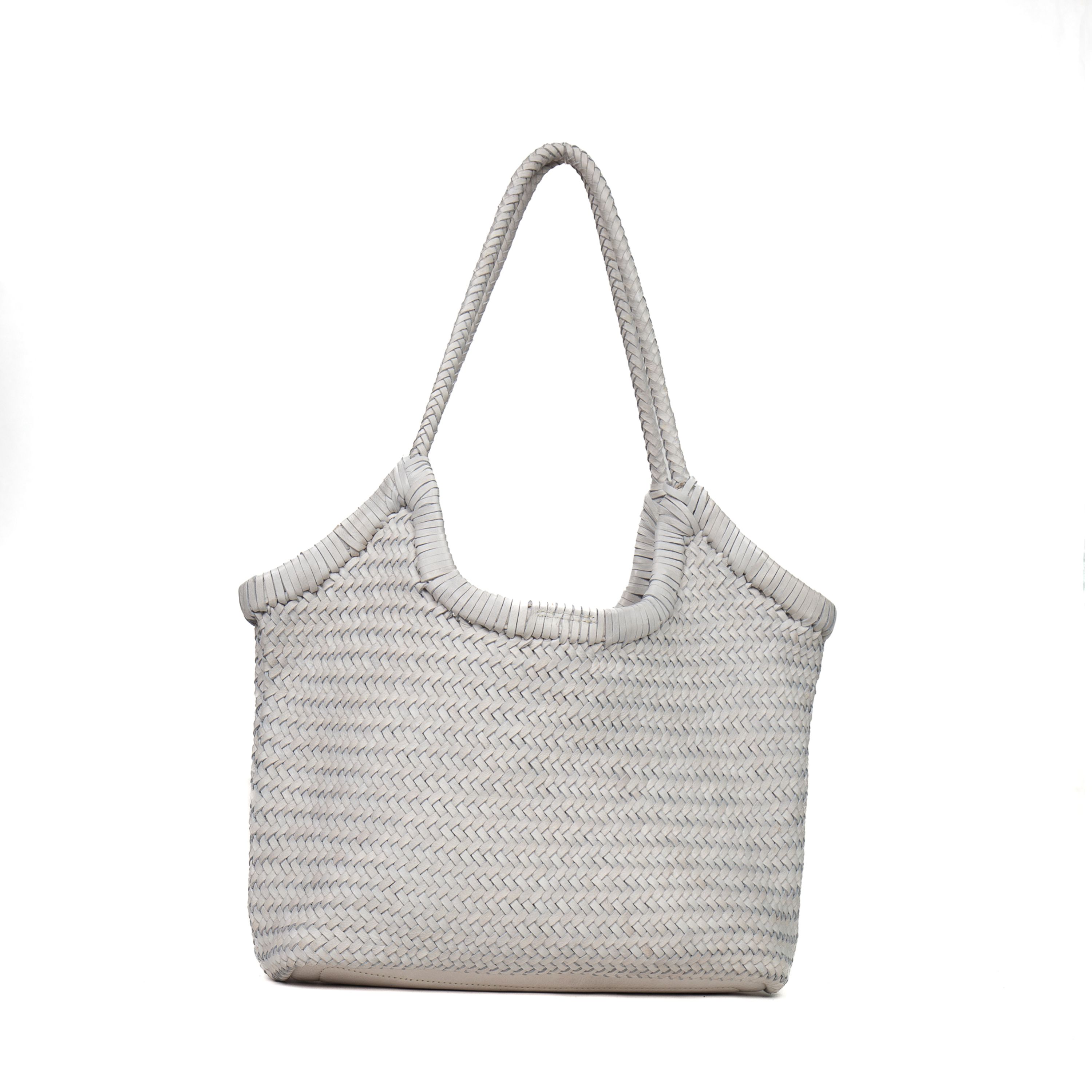 Borsa a spalla da donna realizzata artigianalmente in materiale intrecciato. Colore SAND . Struttura semi-morbida con design geometrico a rombi. Manico singolo rigido rivestito nello stesso materiale intrecciato. Interno foderato con chiusura clip. Dimensioni medie, ideale per uso quotidiano. Prodotto leggero e resistente.