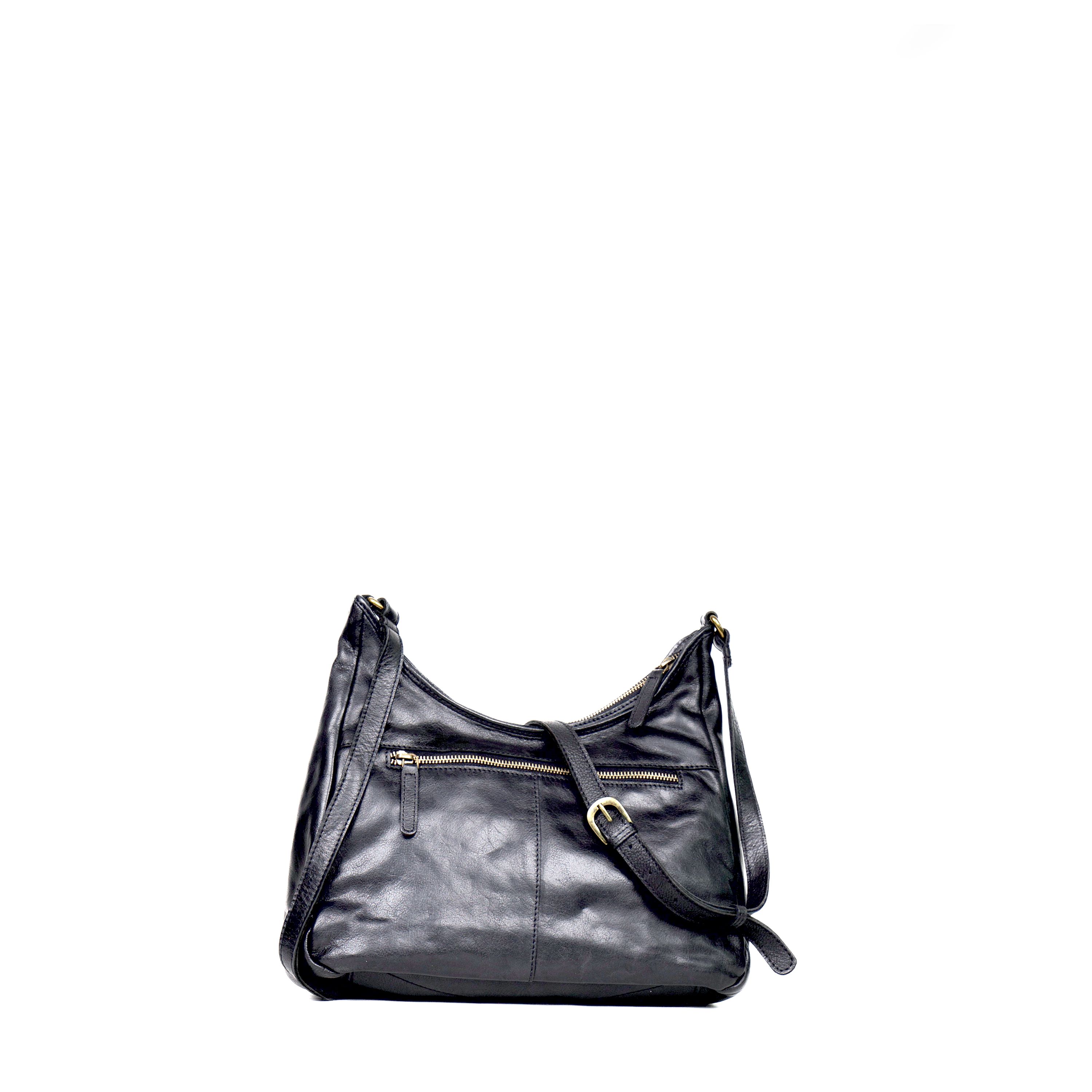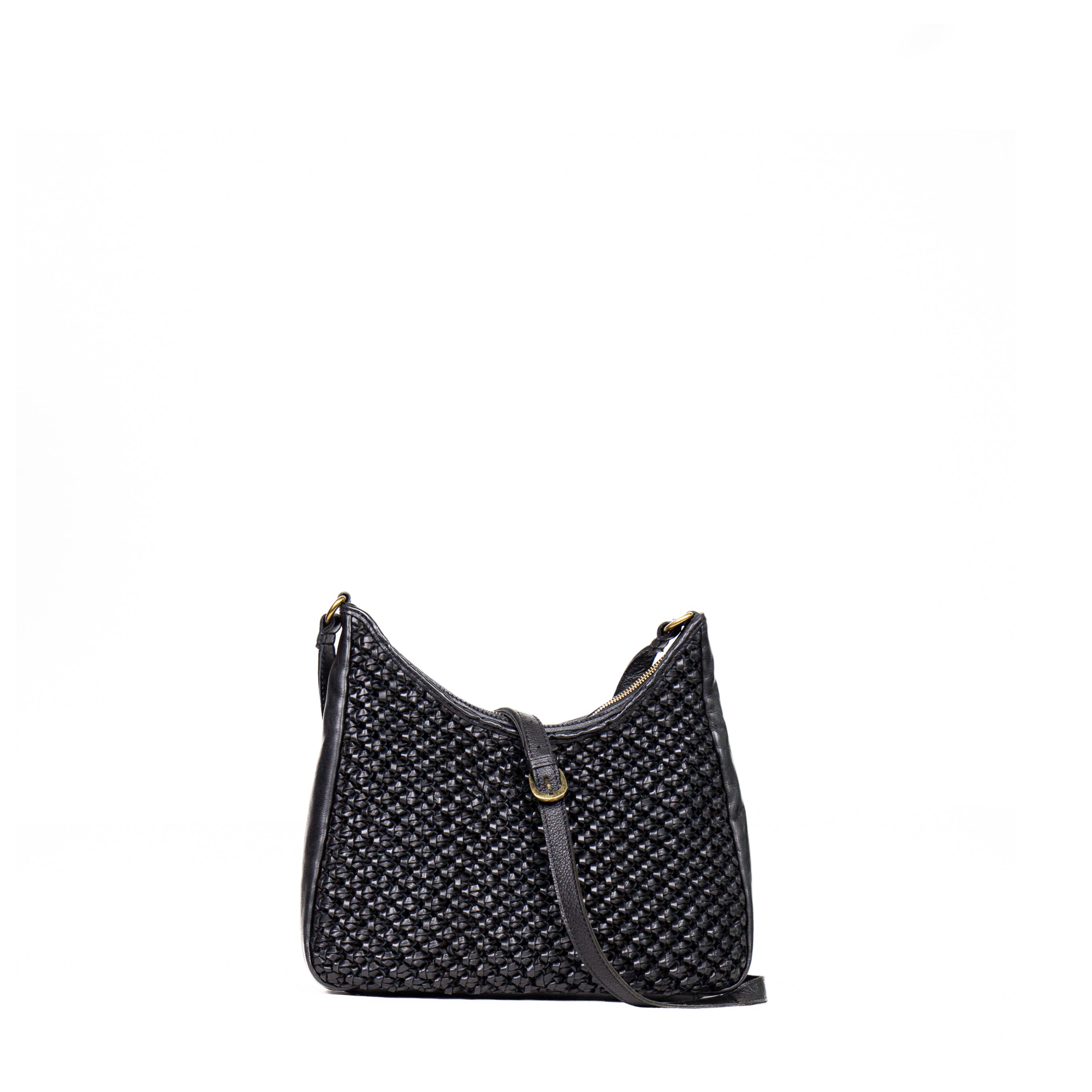 Borsa a spalla da donna realizzata artigianalmente in materiale intrecciato. Colore nero . Struttura semi-morbida con design geometrico a rombi con tracolla regolabile e chiusura a zip. Dimensioni medie, ideale per uso quotidiano. Prodotto leggero e resistente.
