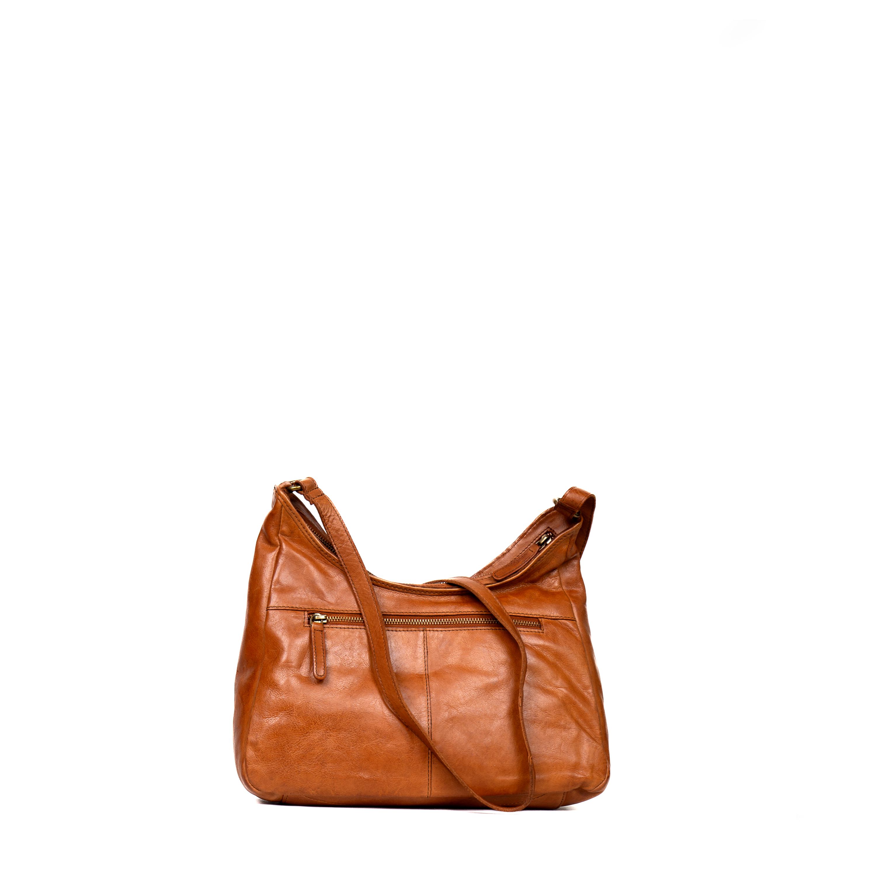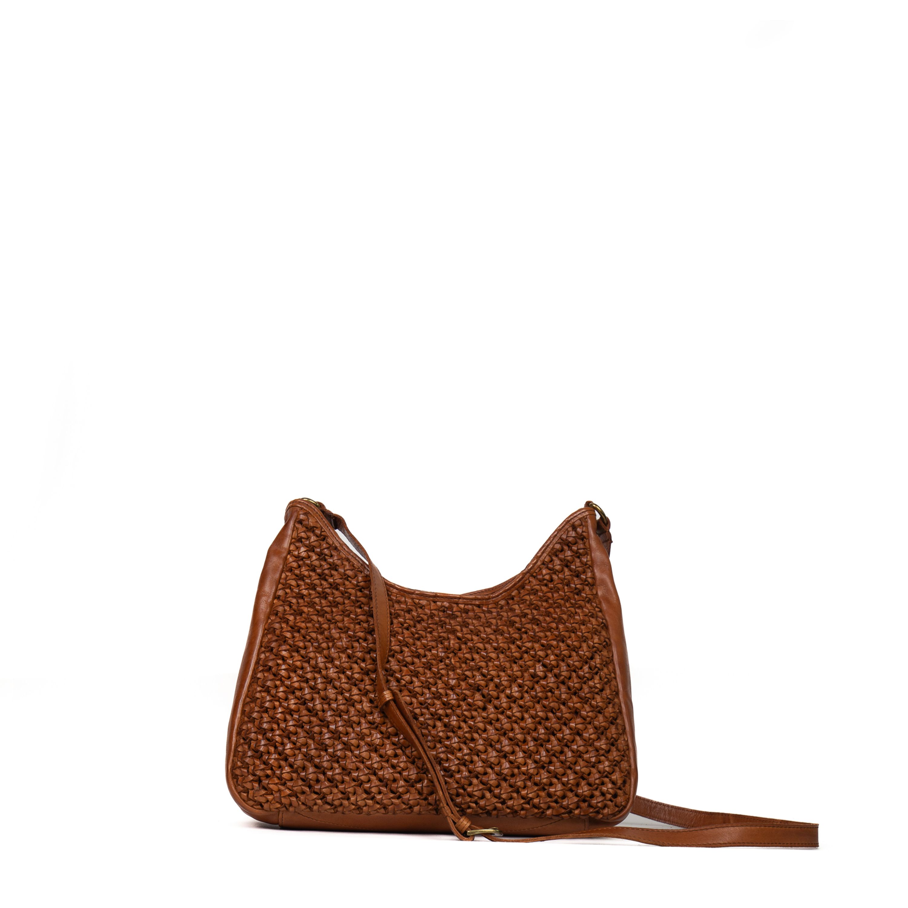 Borsa a spalla da donna realizzata artigianalmente in materiale intrecciato. Colore cognac . Struttura semi-morbida con design geometrico a rombi con tracolla regolabile e chiusura a zip. Dimensioni medie, ideale per uso quotidiano. Prodotto leggero e resistente.