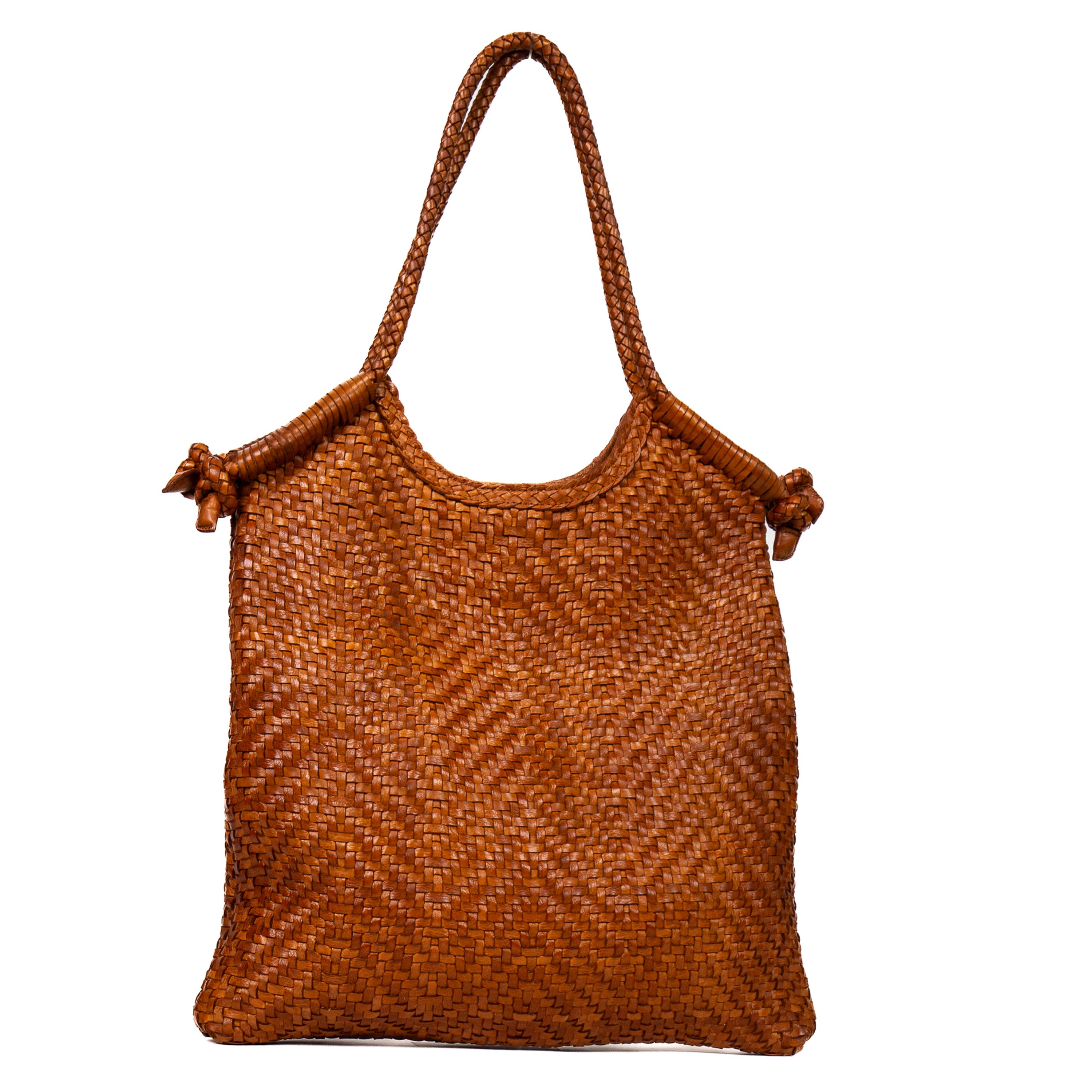 Borsa a spalla da donna realizzata artigianalmente in materiale intrecciato. Colore COGNAC Struttura semi-morbida con design geometrico a rombi. Manico singolo rigido rivestito nello stesso materiale intrecciato. Interno foderato con chiusura clip. Dimensioni medie, ideale per uso quotidiano. Prodotto leggero e resistente.